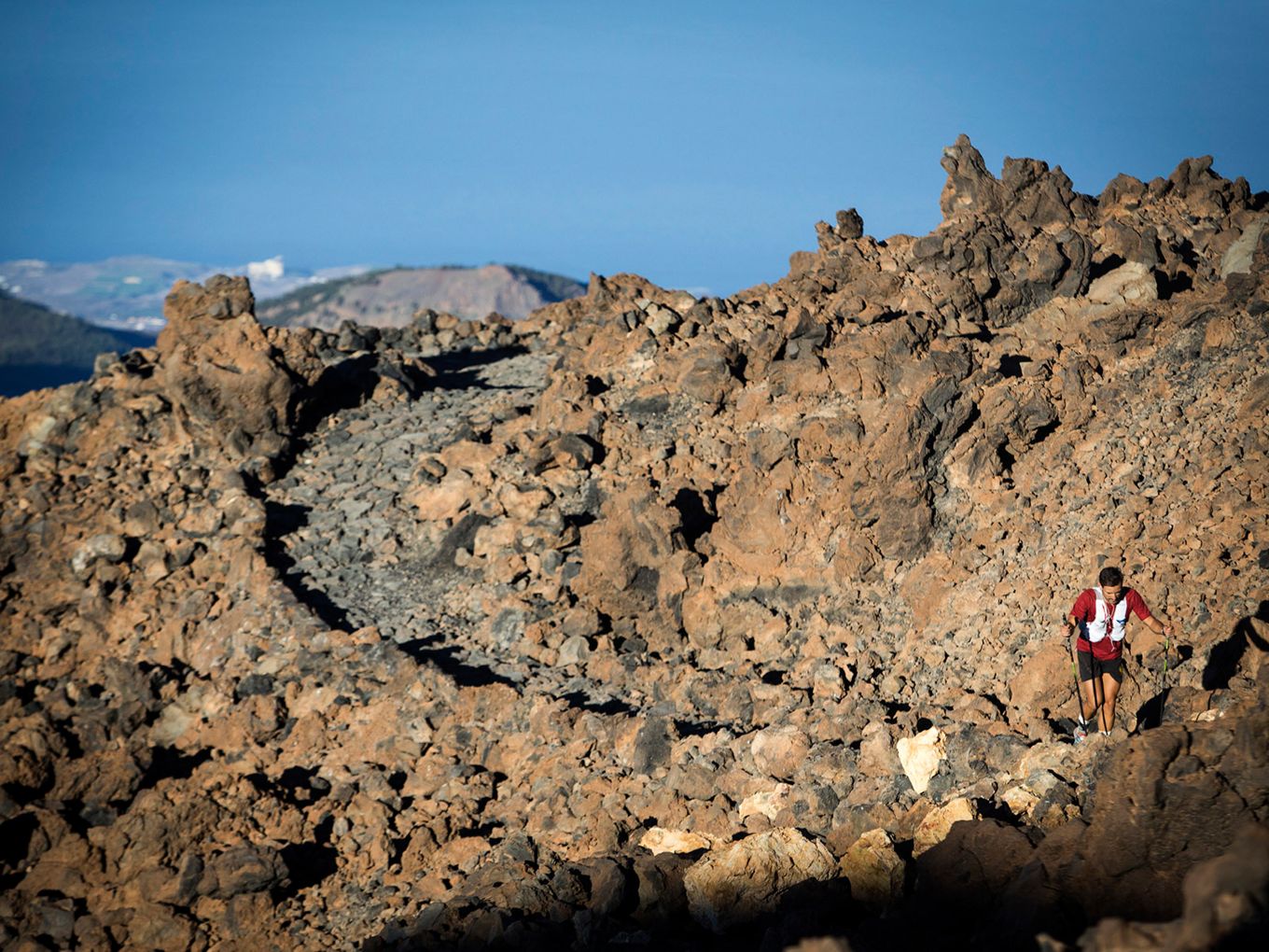 Nur sehr wenige Rennen ermöglichen es, direkt am Meer zu starten und von dort aus zwischen Felsnadeln und Vulkankegeln weiterzulaufen, die steilen Felsformationen der Lavafelder zu erklimmen, um dann die gesamte Insel aus der Nähe des Teide-Gipfels aus zu bewundern. Wer nicht gerade um den Sieg beim Teneriffa Bluetrail mitläuft, sollte hier unbedingt eine Pause einlegen, denn die Aussicht ist wirklich beeindruckend.