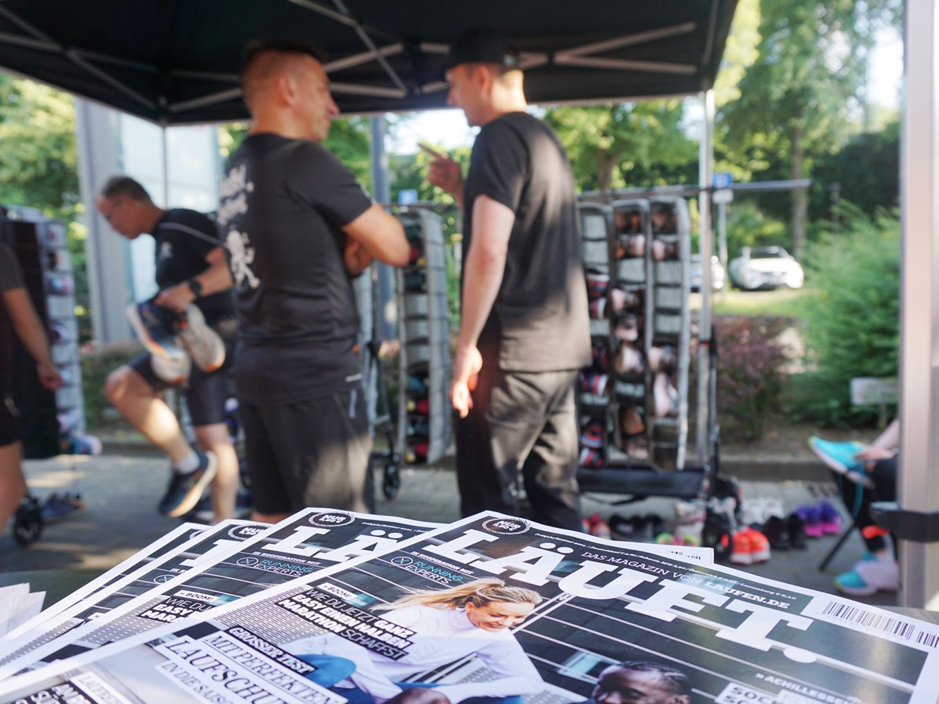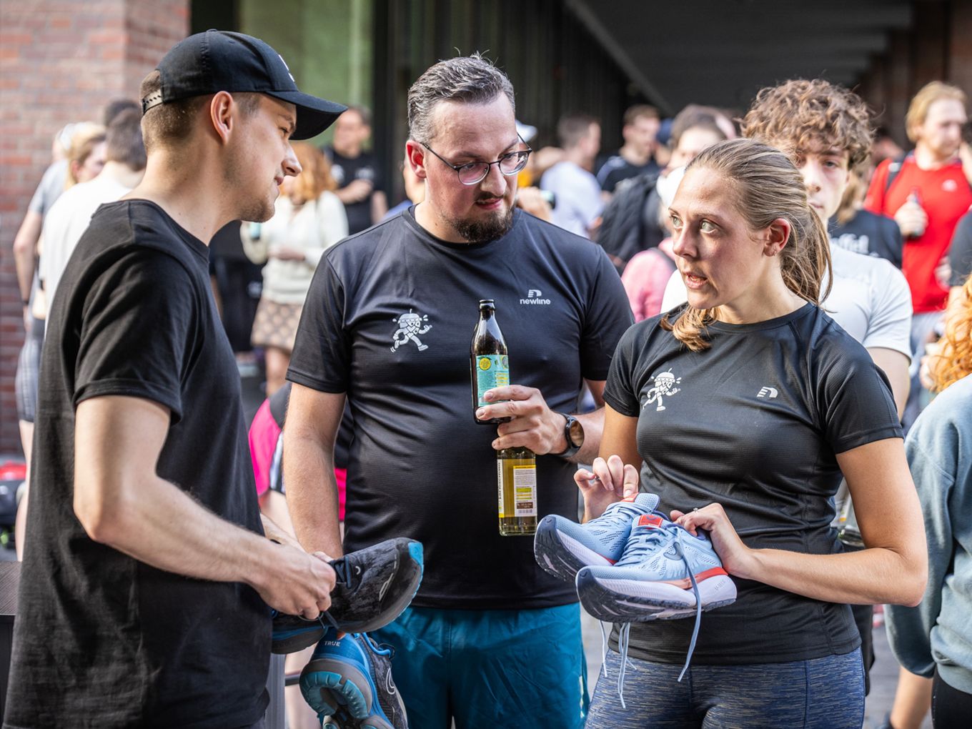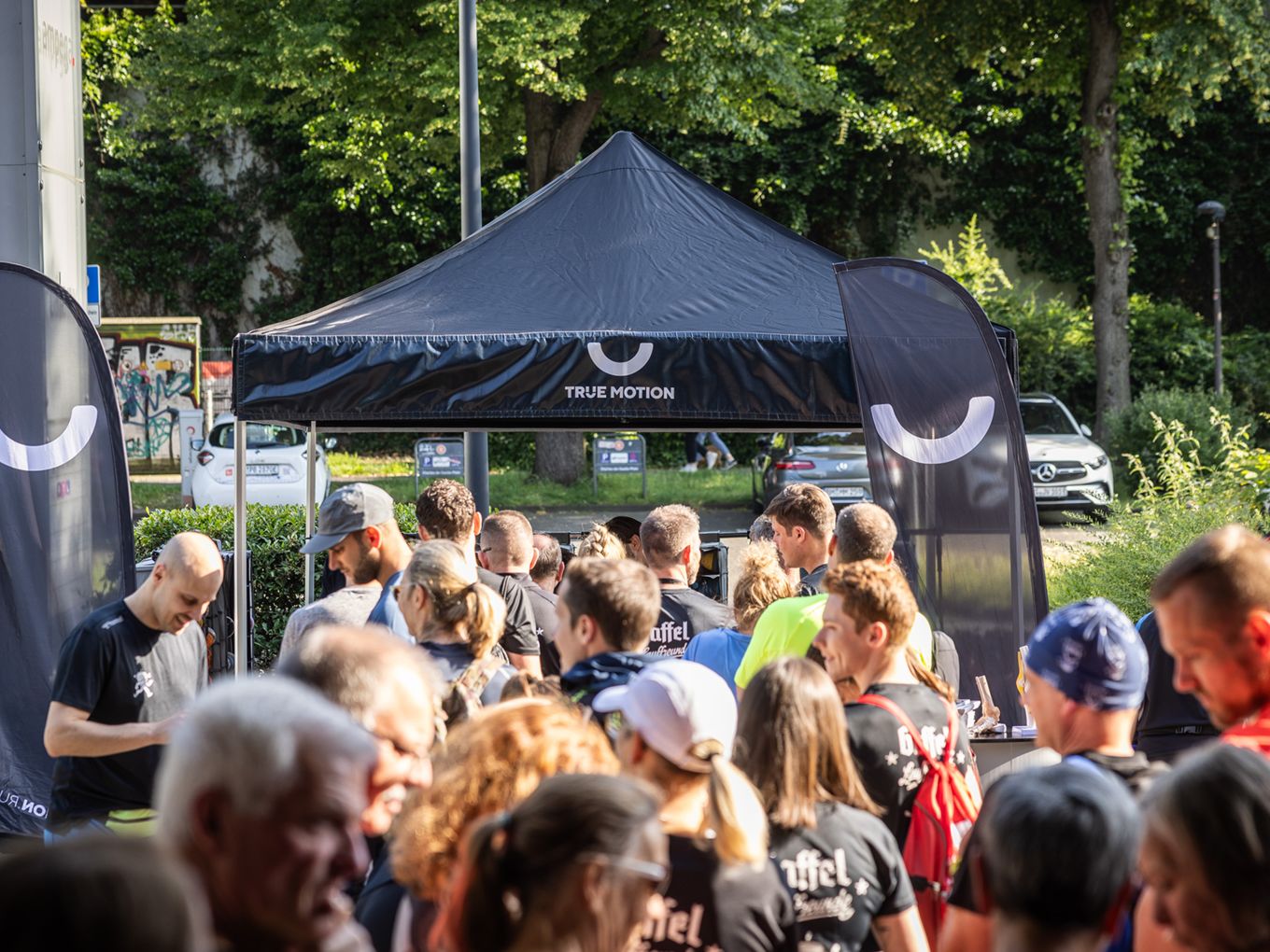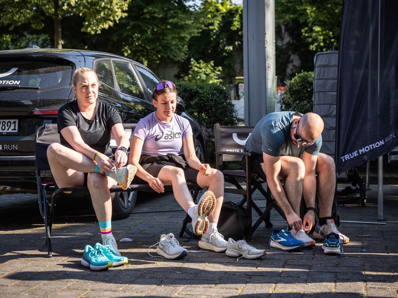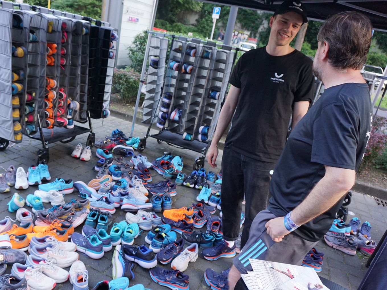 Am Stand von True Motion, der vor gut fünf Jahren in Köln gegründeten Laufschuhmarke, war die Schlange ab 18 Uhr ganz schön lang. "Wir haben den komplett neuen U-Tech Aion 3 dabei, der Schuh ist erst seit heute im Handel", sagte Tillmann Becker-Wahl von True Motion. Er und seine beide Kolleg:innen hatten alle Hände voll zu tun.
