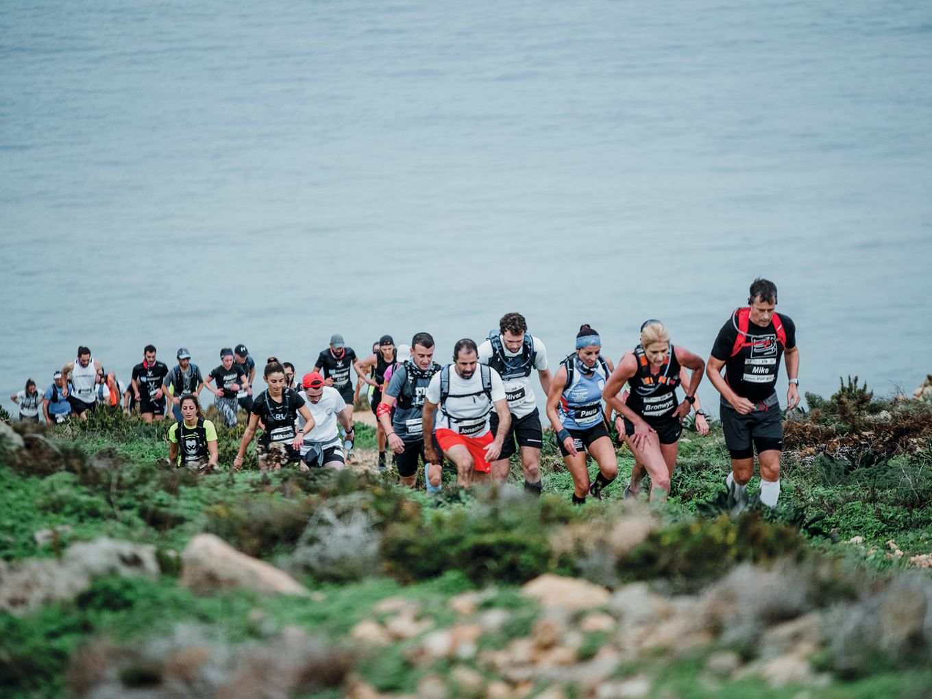 Um elf Uhr stehen dann 135 Läuferinnen und Läufer an der Startlinie. Bevor der Startschuss fällt, ruft ein Mann des Organisations-Teams in die Menge: „Ich hoffe, ihr habt alle eine gut funktionierende Waschmaschine daheim!“ Und damit geht die Schlammschlacht los. Eine schmale Treppe führt direkt über den Wellen des Meeres aus der Bucht Richtung Steilküste. Die Szenerie mit dem türkisfarbenen Meer ist atemberaubend.