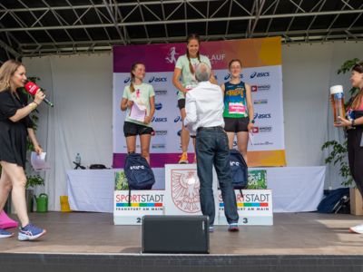 Als Erstes wurden bei sommerlichen Temperaturen die Fünf-Kilometer-Läuferinnen auf die Strecke durch den Frankfurter Stadtwald geschickt. Siegerin über diese Distanz wurde Franziska Dietz (TV 08 Bergheim) in einer Zeit von 22:15 Minuten, gefolgt von Leonie Golla nach 22:59 Minuten. Den dritten Platz belegte Nadine Schattner (United runners of Pfalz) in 23:08 Minuten.