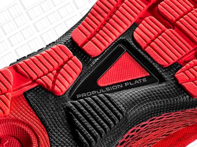 Bei der Konstruktion der „Propulsive Plate“ haben sich die Under Armour-Designer auch von Spikeschuhen inspirieren lassen, die von den Sprintern auf Kunststoffbahnen getragen werden. Gefertigt ist sie aus einer Mischung aus dem Under Armour-eigenen Material Pebax-T und Carbon.