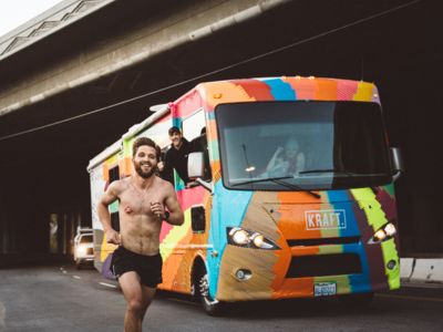 Und noch eine wichtige andere Sache musste vor dem Lauf erledigt werden: Mit einem Wohnmobil und zwei kleineren Wagen würden alle Crew-Mitglieder fahren, die gerade nicht liefen. „Im letzten Jahr hatten wir an das Wohnmobil mit Tapeband ‚Kraft‘ geklebt. Dieses Mal wollten wir den Wagen auffälliger branden“, erzählt Eugen.