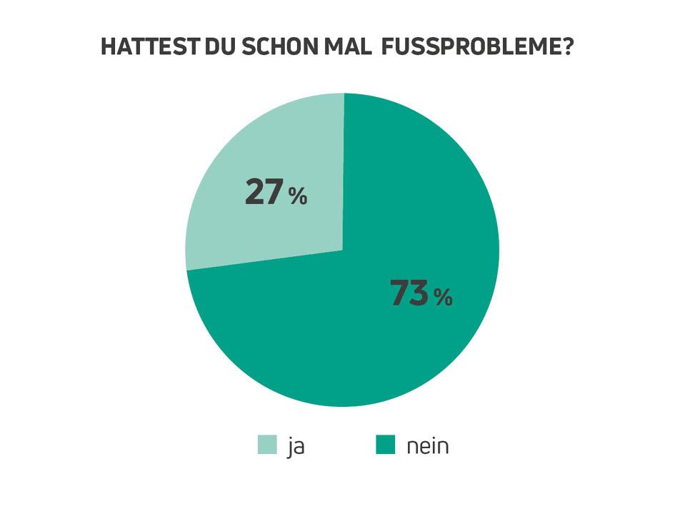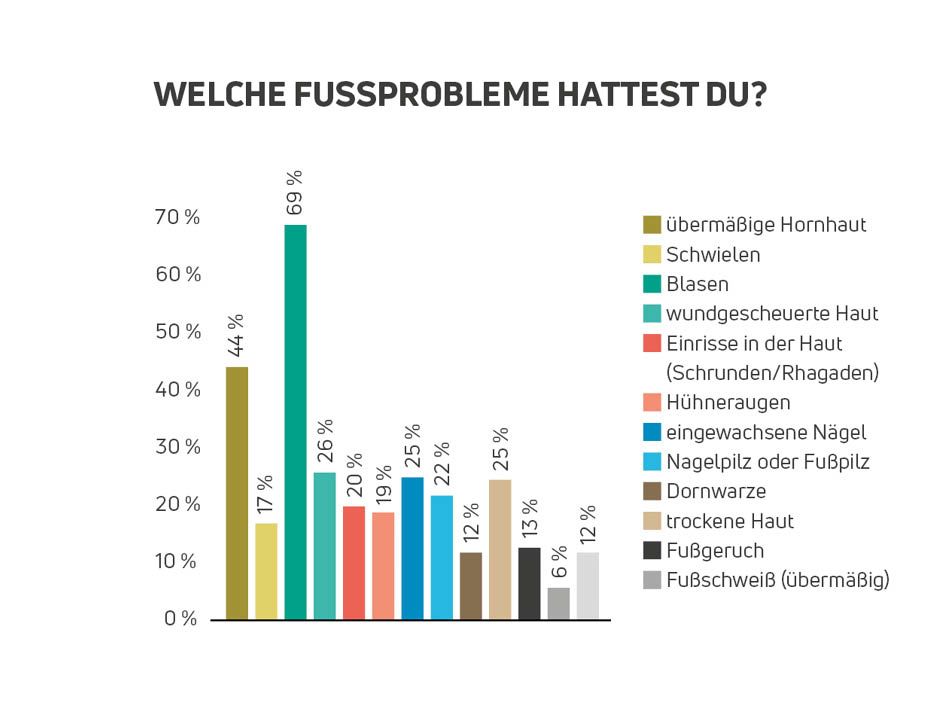 Der Spitzenreiter der Fußprobleme ist ein „Klassiker“: Läufer*innen gaben mit 69 Prozent Blasen am häufigsten an. Dahinter folgen übermäßige Hornhaut (44 Prozent), wundgescheuerte Haut (26 Prozent), eingewachsene Nägel (25 Prozent), Nagelpilz oder Fußpilz (22 Prozent) und Hauteinrisse wie Schrunden und Rhagaden (20 Prozent). In den Kommentaren wurden noch häufiger schwarze oder abgebrochene Nägel genannt, was wie bei Blasen, wundgescheuerter Haut und eingewachsenen Nägeln ebenfalls auf nicht passende Schuhe der Betroffenen hindeutet.