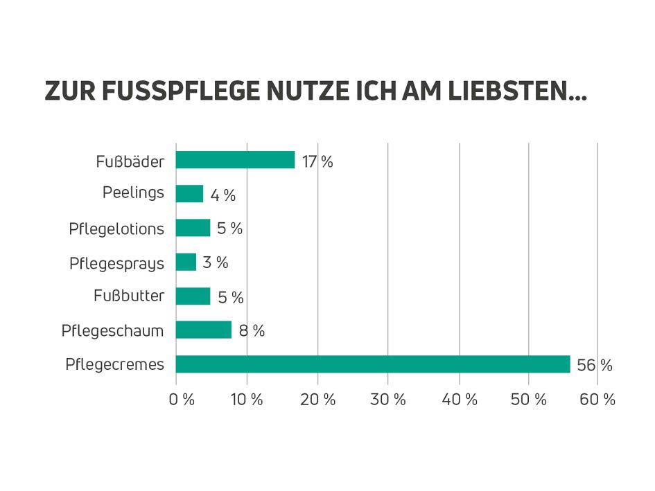 Für Frauen stehen bei den Gründen für die Fußpflege Wohlbefinden und Genuss im Vordergrund. 77 Prozent genießen daher das Eincremen und sehen gepflegte Füße (74 Prozent) als ein Muss an. Bei Männern sind die Gesunderhaltung (42 Prozent) und der Schutz vor Fußproblemen (41 Prozent) die Top-Themen. Die 40- bis 49-jährigen genießen vor allem das Eincremen, und auch bei den 50-59-Jährigen steht Wellness im Vordergrund (38 Prozent). Andere Gründe sind über die Altersgruppen relativ gleich verteilt.