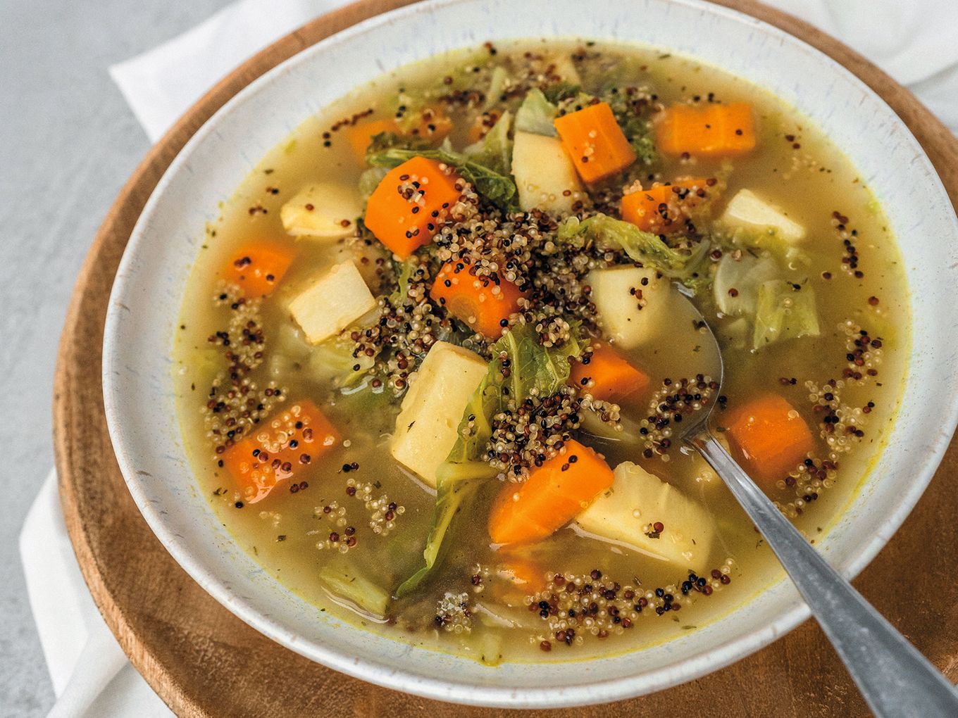 ⇢❶ Schneide die Zwiebel in grobe Würfel und zerkleinere auch die Steckrübe, Möhre und den Wirsing (ohne Strunk). ⇢❷ Brate die Zwiebel in einem großen Suppentopf mit Olivenöl kurz an. Gib die Möhren- und Steckrübenwürfel dazu und brate für weitere drei bis fünf Minuten. Nun gib auch die Wirsingstreifen dazu und brate alles noch mal für zwei Minuten an. ⇢❸ Danach gieße die Gemüsebrühe auf und lasse alles fünf bis zehn Minuten köcheln. ⇢❹ Gib alle Gewürze und die Quinoasamen dazu und koche die Suppe auf mittlerer Stufe bis das Gemüse weich und die Quinoasamen durch sind. Schmecke zum Schluss mit Salz und Pfeffer ab.