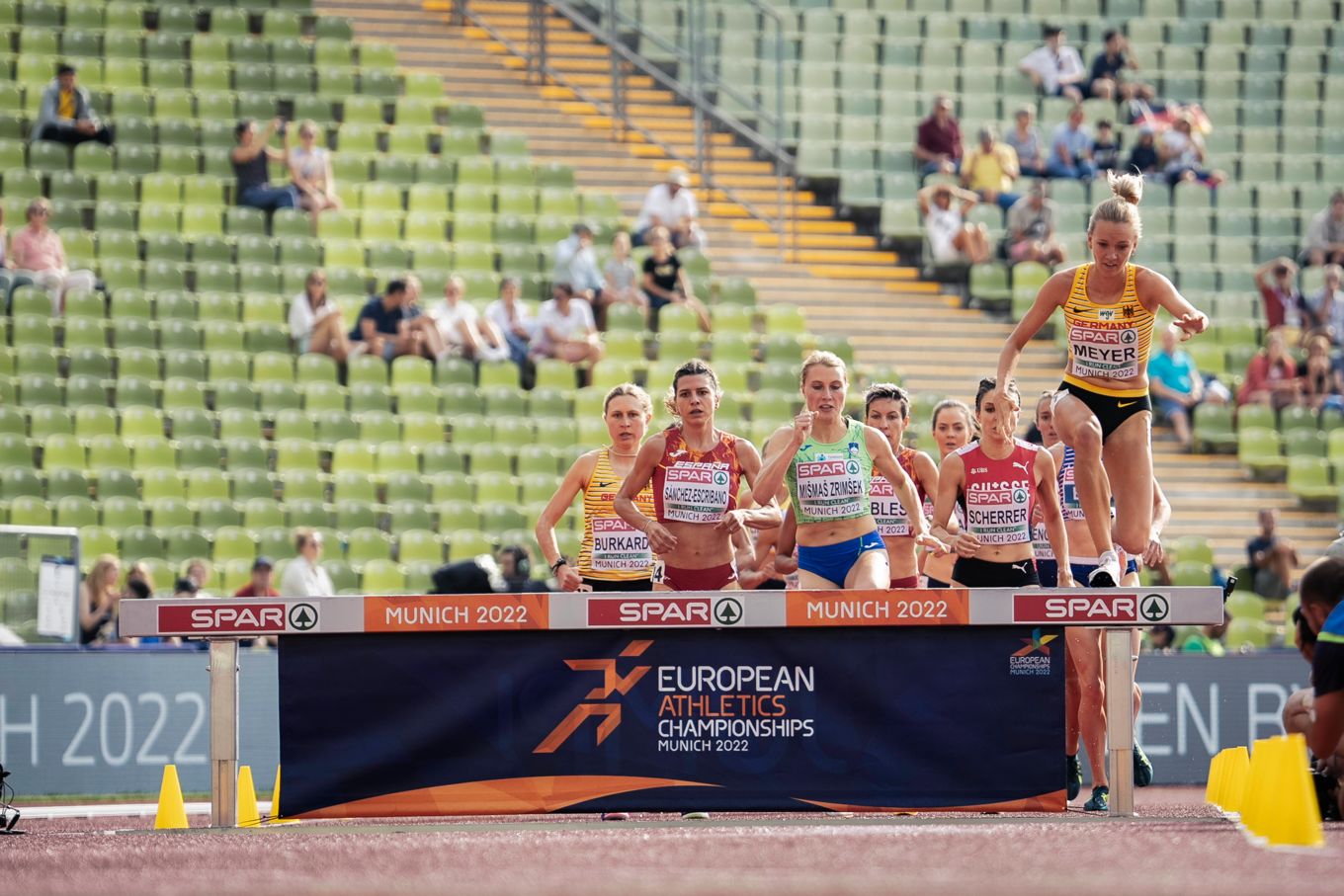Über 3.000 Meter Hindernis der Frauen sind auch ohne Titelverteidigerin Gesa Krause mit Lea Meyer vom ASV Köln und Elena Burkard (LG farbtex Nordschwarzwald) zwei deutsche Läuferinnen im Finale am Start. Vor allem Lea Meyer geht aussichtsreich in das Renne, das um 22:13 Uhr gestartet wird. Nach ihrem unglücklichen Auftritt bei den Weltmeisterschaften in Eugene, als sie im Vorlauf gleich am ersten Hindernis hängenblieb, kopfüber in den Wassergraben stürzte und das Rennen dennoch tapfer beendete, lieferte die 24-Jährige in München einen ganz souveränen Vorlauf ab. Als Siegerin qualifizierte sie sich sicher in 9:39,55 Minuten für das Finale, das am Samstagabend um 22:13 Uhr gestartet wird.