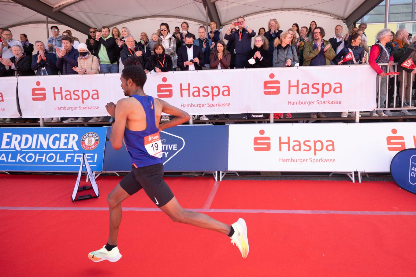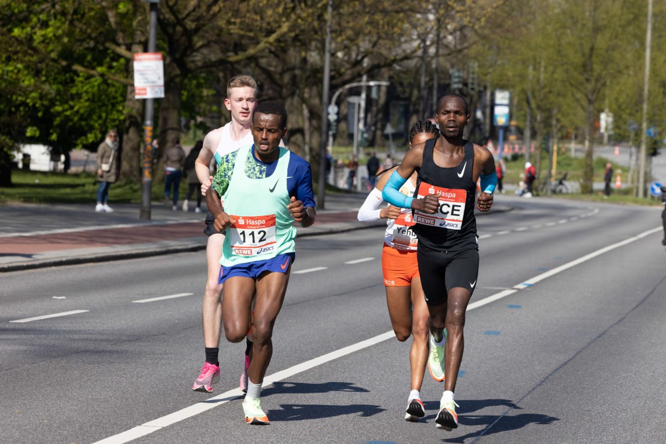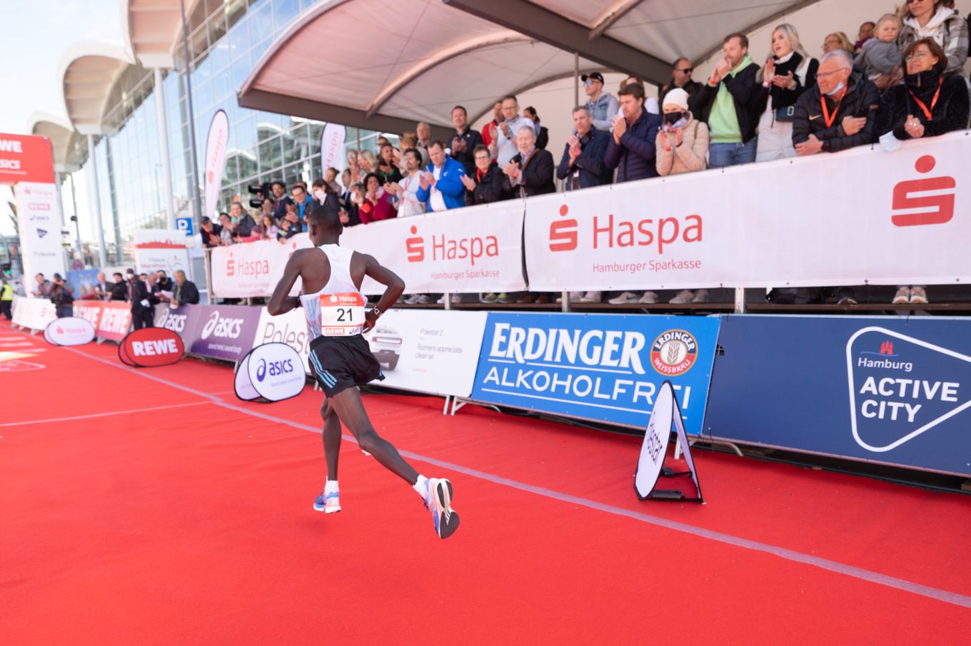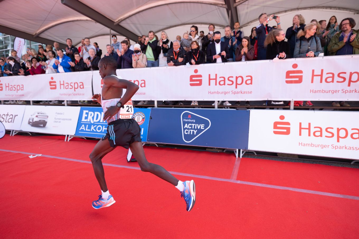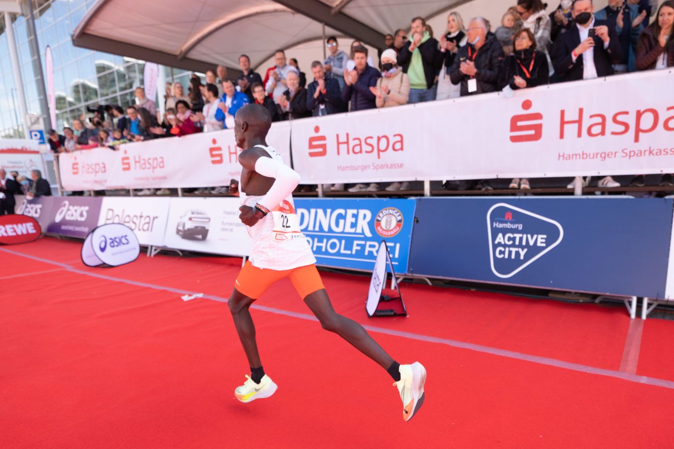 Seinen Streckenrekord ist Eliud Kipchoge seit dem 24. April 2022 aber los. Gleich vier Athleten unterboten Kipchoges 2:05:30 Stunden. Cybrian Kotut (Kenia) und Stephen Kissa (Uganda) waren die beiden Läufer, die aus der großen Gruppe der Eliteläufer übrig blieben. Erst auf dem roten Teppich vor dem Ziel an der Messe Hamburg fiel die Entscheidung. Kotut behielt mit 2:04:47 zu 2:04:48 Stunden knapp die Oberhand. Dahinter folgten Workineh Tadesse (Äthiopien/2:05:07 h) und Victor Kiplangat (Uganda/2:05:09 h).