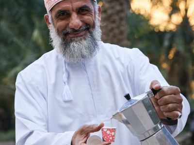 Abends in Nizwa geht es dann in den Souq. Der traditionelle Markt der alten Handelsstadt bietet von Datteln über Tahini, bis hin zu Krumdolchen, Weihrauchbrennern und Wunderlampen eine hervorragende Gelegenheit, sich mit Souvenirs einzudecken oder auch Spezialitäten probieren, wie Kaffee mit Kamelmilch, so wie ihn die Beduinen trinken. Khalids Tipp: „unbedingt verhandeln, das gehört dazu!“ Und für alle, die bis dato noch nicht mit Ziegen auf Tuchfühlung waren: immer freitags findet direkt neben dem Souq ein traditioneller Viehmarkt mit Auktion statt.