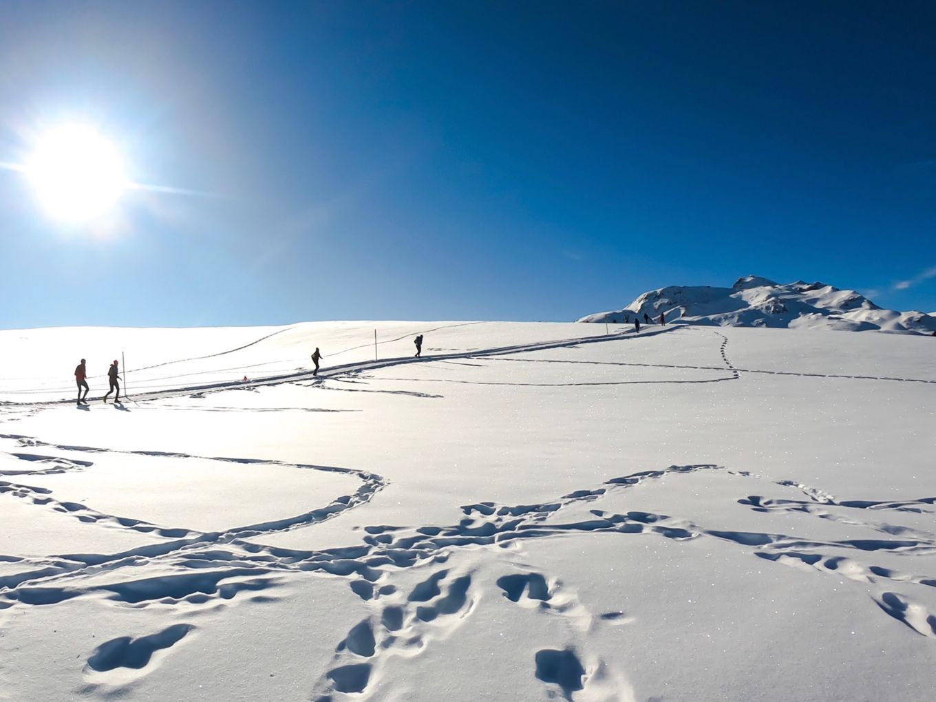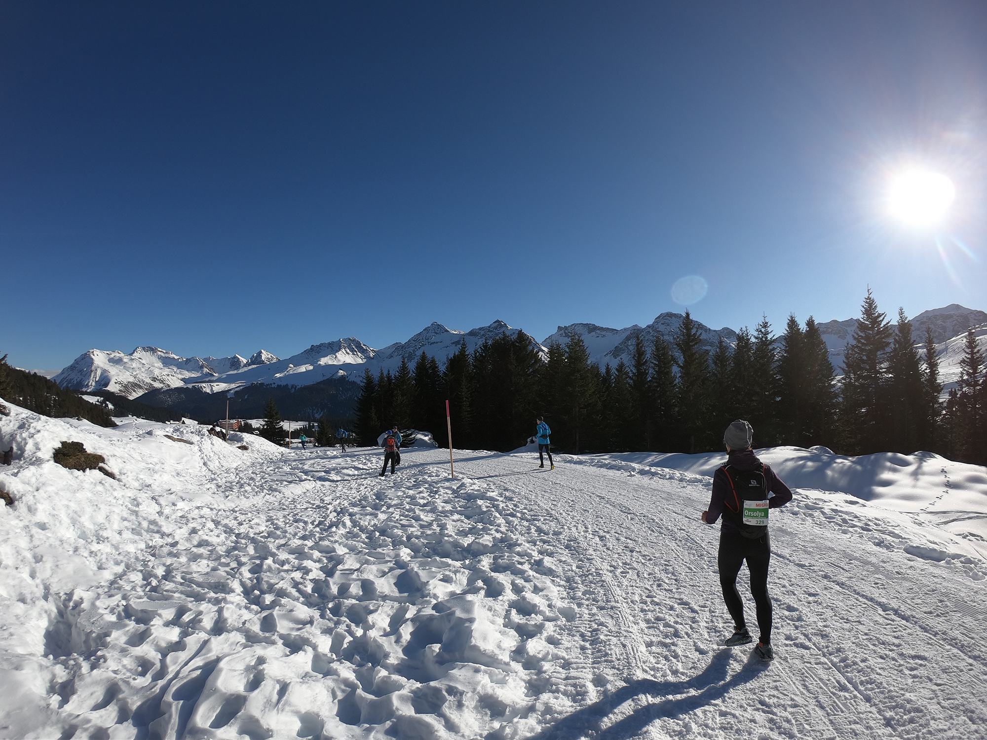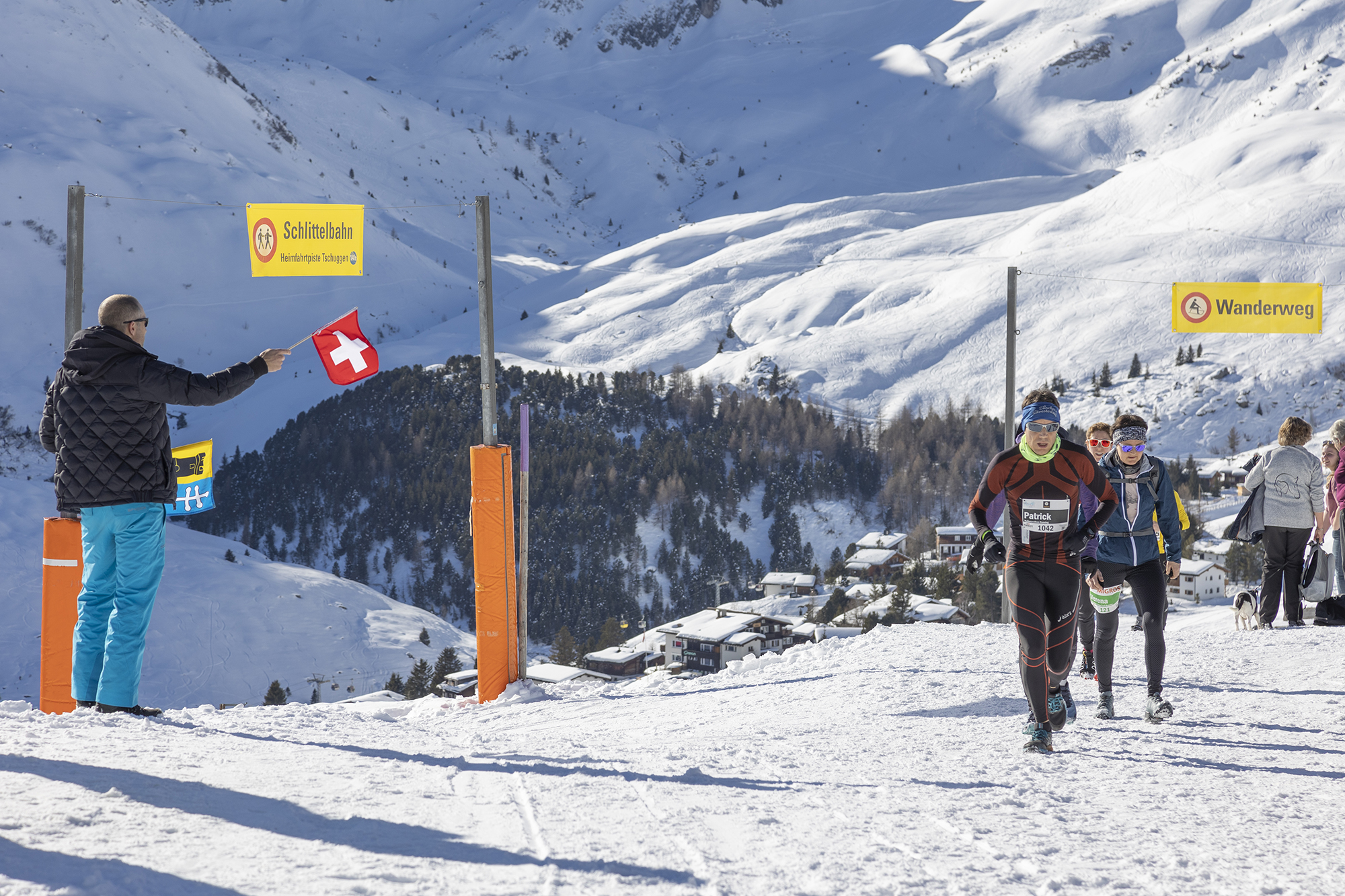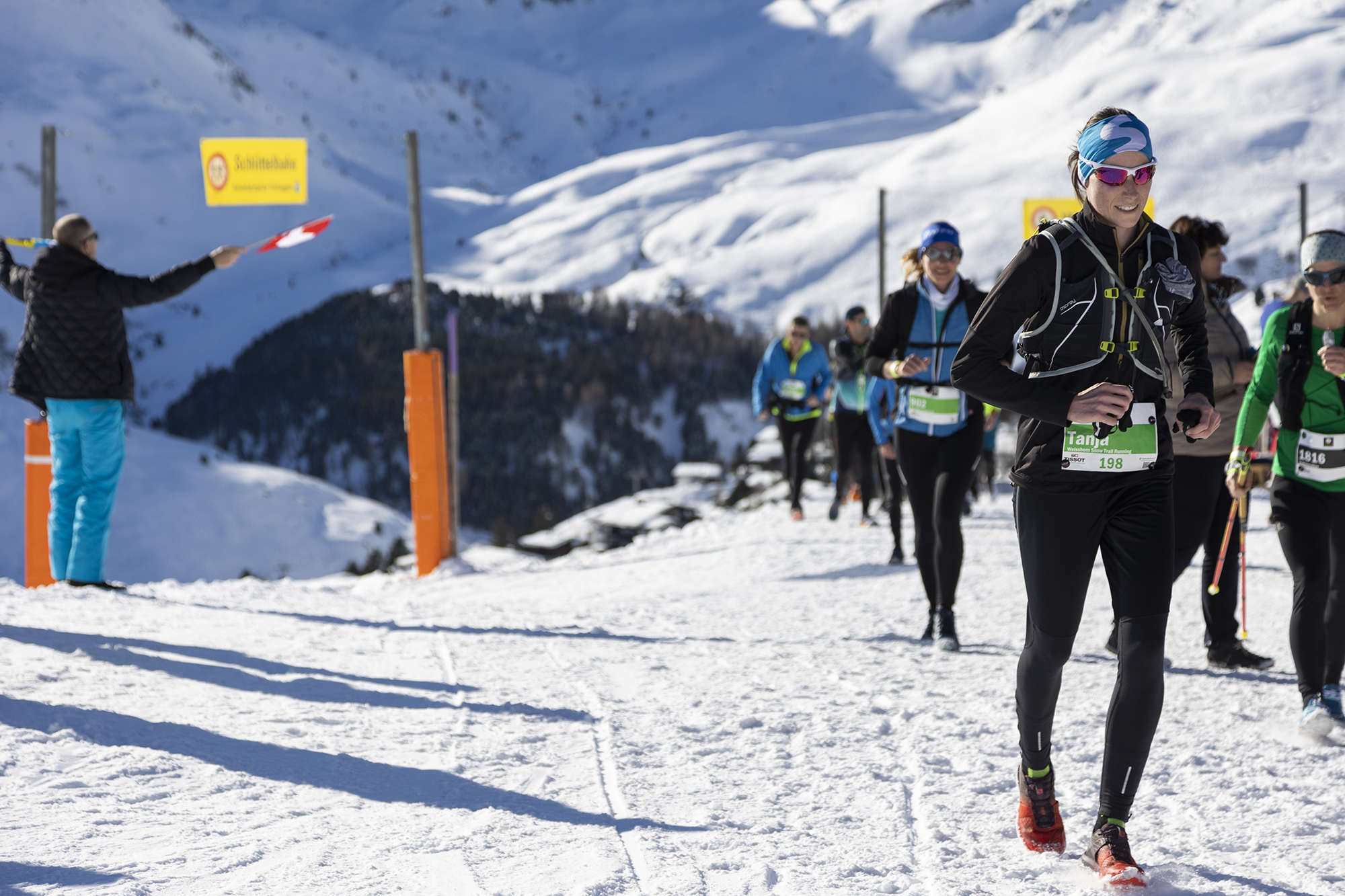 Schon bald ist die Baumgrenze überschritten und an der Tschuggenhütte auf 1990 Meter Höhe die erste Versorgungsstation erreicht. Hier hat gerade eine Musikgruppe ihren lautstarken Einsatz. Danach müssen ein paar Mal die Skipisten gekreuzt werden. Es sieht zunächst chaotisch aus, Skifahrer, Snowboarder und Läufer verteilen sich auf den bestens präparierten Pisten, an den Liften herrscht Hochbetrieb und die Streckenposten haben alle Hände voll zu tun. Aber es ist genug Platz für alle da, die Begegnungen zeugen von friedlicher Koexistenz und gegenseitiger Rücksichtnahme.