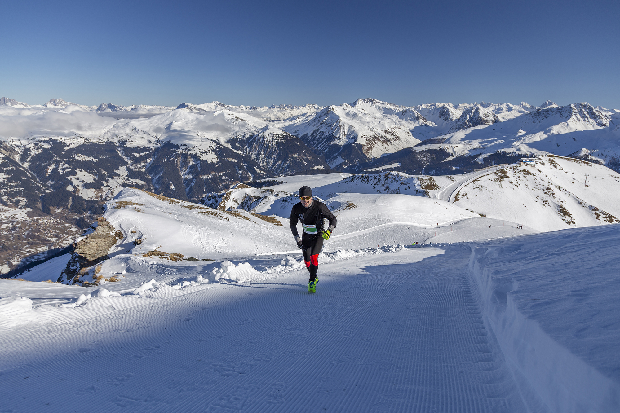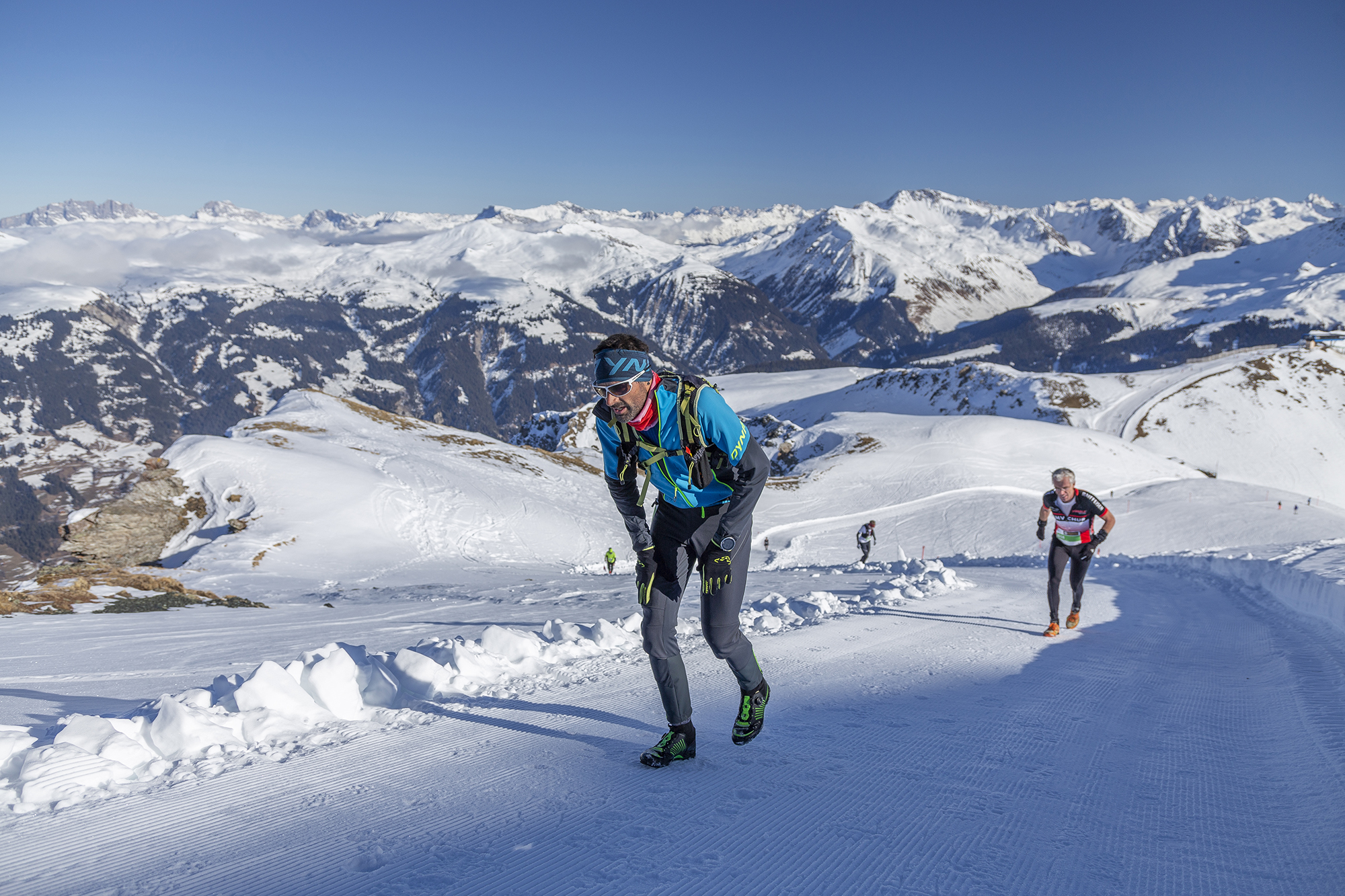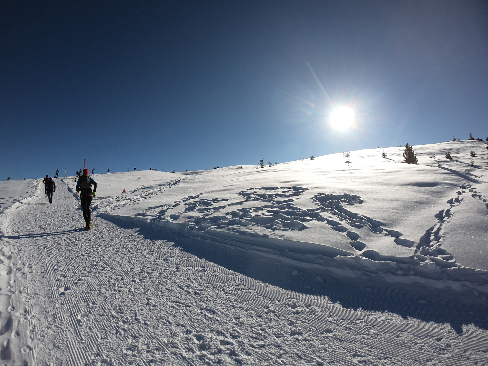 Mit kurzen Schritten arbeite ich mich nach oben. Die Trailschuhe mit Stahlnoppen beißen sich in den Schnee. Aber die bestens präparierte Piste ist so griffig, dass sie auch mit normalen Laufschuhen bewältigt werden kann. Erst im letzten Viertel geht es richtig zur Sache, wo zu großen Teilen im Tiefschnee, noch fast 600 steile Höhenmeter warten. Hier werden auch die Spitzenläufer zu Gehern. Schwerarbeit! Die Lunge pfeift, der Puls hämmert und der Schweiß läuft – trotz der Kälte. Und immer öfter geht es zwei Schritte vorwärts und einen zurück. Aber, das satte Alpenpanorama mit einer ganzen Galerie von Eis- und Schneeriesen, die vor dem tiefblauen Himmel in der Sonne glänzen, berauscht die Sinne. Eine friedliche, meditative Stimmung, die einfach nur glücklich macht und die Strapazen zu einem belanglosen Beiwerk degradieren. Winterzauber pur, auch wenn es kitschig klingt.