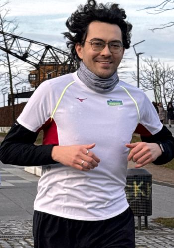 Der 30 Jahre alte Architekt kommt aus Berlin und arbeitet nebenberuflich als Laufschuhberater. „Ich helfe Läufern und Läuferinnen, den passenden und auch richtigen Schuh zu finden“, sagt er mit einem Lächeln. Er selbst hat den super-komfortablen Wave Sky 8 von Mizuno für die kommenden Trainingsmonate gewählt.