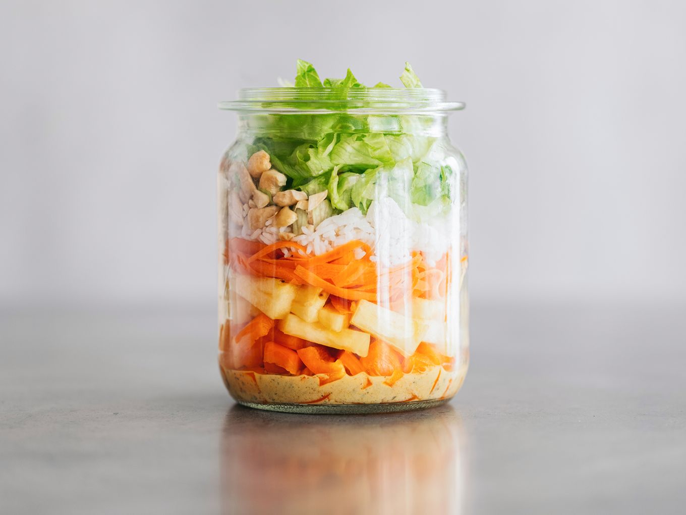 ⇢❶ Koche den Reis nach der Packungsanleitung. ⇢❷ Während der Kochzeit schneide die Ananas in Würfel. Wenn du Zeit hast, schneide sie erst in Scheiben und grille diese kurz auf dem Grill an. ⇢❸ Anschließend schneide die Paprika und raspele die Möhre mit einem Sparschäler in dünne längliche Scheiben. ⇢❹ Danach kannst du das Dressing anrühren und die Cashews hacken. ⇢❺ Wasche und zerkleinere den Salat und richte alles zusammen an.