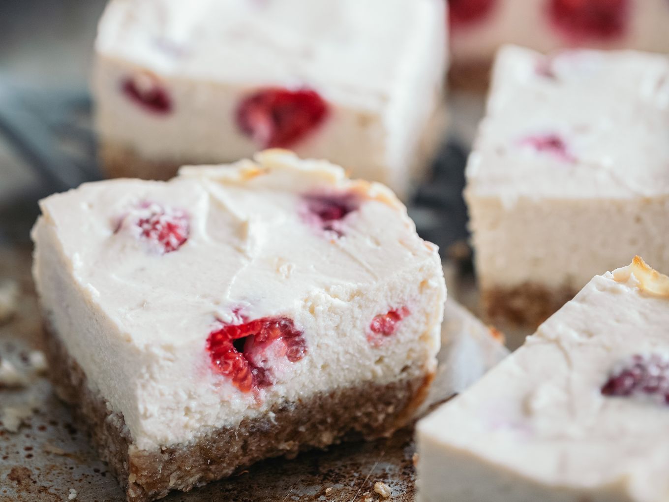⇢❶ Heize den Ofen auf 180 Grad Ober-Unter-Hitze vor. ⇢❷ Gib die Haferflocken in einen Mixer und zerkleinere sie. Füge die Datteln, das Kokosöl und die gemahlenen Mandeln hinzu und püriere alles zu einer homogenen Masse. Drücke sie in eine flache Backform, die mit Backpapier ausgelegt ist. ⇢❸ Für die Creme vermenge alle Zutaten bis auf die Himbeeren gut miteinander. Anschließend hebe die Himbeeren unter und verteile die Creme auf dem Kuchenboden. ⇢❹ Nun backe die Cheesecake-Schnitten für 20-25 Minuten im Ofen. Wenn sie abgekühlt sind, teile sie in neun gleich große Stücke.