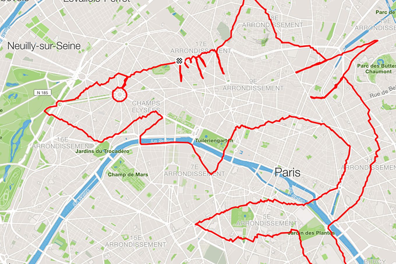 Wie weit muss man wohl durch Paris laufen, um mit seinem GPS-Tracking einen perfekten Hai auf die Karten der Stadt an der Seine zu zeichnen? Die Antwort lieferte die französische Instabloggerin Marine Leleu am 28. Oktober 2018. In zehneinhalb Stunden ist sie für diesen Hai 50 Kilometer durch die Straßen von Paris gelaufen. Ohne Pausen und nach den Vorgaben ihrer Freundin Chloé, die sich zuvor um die Ausarbeitung der Strecke gekümmert hatte. Wie lange die dafür gebraucht hat, ist nicht überliefert.
