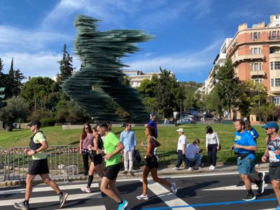 Bei km 40 erreichten man den Rizari-Park und passierte kurz vorher eine 12 Meter hohe gläsernen Statue des Bildhauers Costas Varotsos. Die beeindruckende Statue O Dromeas „Der Läufer“ zeigt einen Läufer in Bewegung. Genau zum richtigen Zeitpunkt schien die Sonne auf das Denkmal und reflektierte in den Glasschichten - toller Anblick. „Páme! Páme!“ war mittlerweile zu einem echten Ohrwurm geworden. Je näher man dem Marathonziel im alten Panathinaiko Stadion von Athen kamen, umso lauter trieben diese Anfeuerung der Fans die LäuferInnen voran.