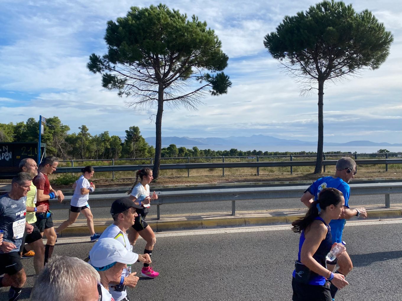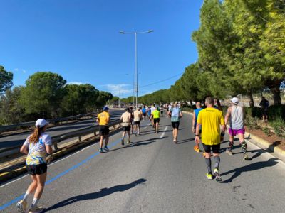 Die Strecke führte zunächst nach Süden. Das erste Highlight der Strecke war bei Kilometer 6 erreicht. Hier wurde der Grabhügel der gefallenen griechischen Kämpfer aus dem Perser-Krieg umrundet. Wie an vielen weiteren Stellen wurden Olivenzweige von den ZuschauerInnen an die LäuferInnen verteilt. Eine freundliche Geste welche die Motivation noch einmal erhöhte! Eingeklemmt in Getränkegurte, Kappen oder Haargummis wurden die Olivenzweige voller Stolz über den Rest der Marathonstrecke getragen! Es ging weiter auf einer Schnellstraße in Richtung Athen. Vorbei an Olivenplantagen, mit Blick auf das Meer! Vor den LäuferInnen lagen aber auch die Hügelketten vor Athen.