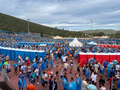 Im Startbereich konnte man sich noch etwas ausruhen, bevor um 09:00Uhr der Startschuss für die erste Welle ertönte! Auf dem Sportgelände am Startbereich war ebenfalls alles perfekt organisiert: große LKWs für das Läufergepäck, ausreichend Toiletten, gute Beschilderung der Startblöcke, große Ruheflächen auf dem Kunstrasen, Musik & Ansagen sowie eine Tartanbahn zum warmlaufen! Weiter ging’s in die Startblöcke. Auf der Höhe der hinteren Blöcken brannte das „Marathonfeuer“ in einer Fackel, welche am Vortag in einer feierlichen Zeromonie am Grabhügel der gefallenen Athener in Marathon entzündet worden war. So manch einer erlebte seinen Schüttelfrostmoment noch vor dem Startcountdown! Die Anzahl der Drohnen über dem Starterfeld deutete an, dass es bald losgehen würde. 3, 2, 1 -Start!
