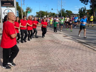 An verschiedenen Stellen standen DJs mit riesigen Boxen und sorgten für gute Stimmung. Dieses Lauf-Event entwickelte sich bei warmen Temperaturen zu einem Volksfest auf 42,195km in Richtung Athener Innenstadt. In Rafína konnte man im Mittelstreifen der Avenue Marathonos eine Bronzestatue von Pheidippides entdecken! Mit der Brust nach vorne gebeugt vermittelte er den TeilnehmerInnen deutlich seine klare Botschaft: „Páme“! „Auf geht’s“!