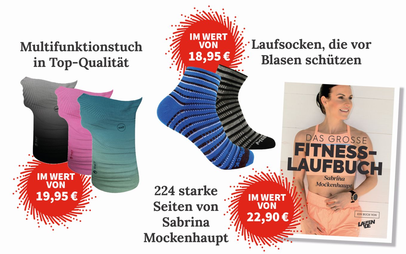Wer jetzt hier LÄUFT. für nur 14,90 Euro im Jahr abonniert, hat umgehend Zugriff auf alle exklusiven Inhalte auf laufen.de. Und dazu schenken wir dir auch noch ein Paar hochwertige Laufsocken von Wrightsock, die vor Blasen schützen (kosten sonst 18,95 €), das große Fitness-Laufbuch von Sabrina Mockenhaupt (kostet sonst 22,90 Euro) oder ein selbstreinigendes Multifunktionstuch von H.A.D. (kostet sonst 19,95 €). Und wenn du dich für nur vier Euro mehr das Jahres-Abo inklusive gedruckten Magazinen entscheidest, senden wir dir umgehend die aktuelle Ausgabe plus unser Special Road Races zu, in dem du alle Infos zu den schönsten Laufevents 2024 findest. Das 132 Seiten starke Sonderheft erhältst du gratis zur aktuellen Ausgabe von LÄUFT. Der Doppelpack ist ideal, um dein Laufjahr 2024 zu planen! Lass' dir jetzt dein Fitnesspaket mit deiner Prämie nach Hause schicken und nutze anschließend alle exklusiven LÄUFT.-Inhalte auf laufen.de für ein ganzes Jahr! Dazu zählen auch die digitale Version des Fitness-Laufbuchs von Sabrina Mockenhaupt, alle digitalen LÄUFT.-Magazine und unsere bewährten Trainingspläne, die nur unseren Abonnentinnen und Abonnenten zur Verfügung stehen!