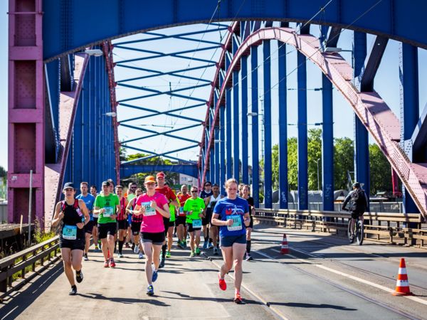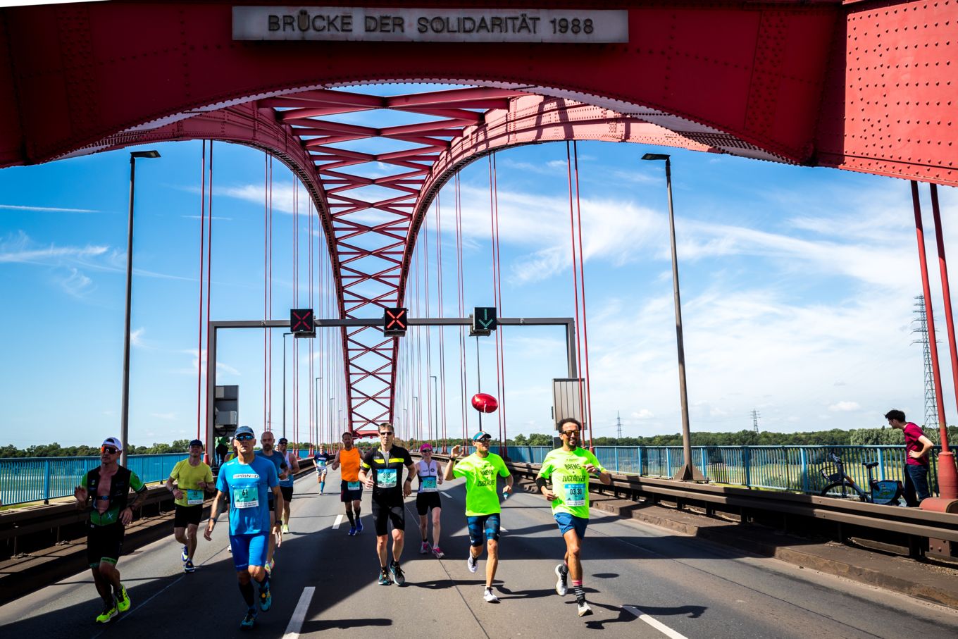 Über dem Rhein genießen die Läuferinnen und Läufer einen der schönsten Weitblicke überhaupt. Der große Strom in seiner ganzen Macht. Das Grün des Südens und des Westens, das Grau der Stadtlandschaft mit ihren hoch aufschießenden Schornsteinen mit Blick nach Osten und Norden. Eine Augenweide, die aber beim Marathon oft ein klein wenig vom Ausblick auf den „Mann mit dem Hammer“ getrübt wird, der schon bald darauf auf einige wartet.