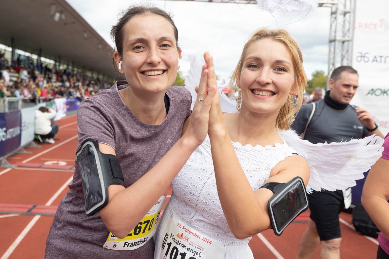 Bevor die die große Läuferschar u.a. von (zuletzt 2024) knapp 1000 Finishern beim Marathon und nahezu 5000 beim Halbmarathon im Carl-Kaufmann Stadion ins Ziel kommt, zeigt sich Karlsruhe von seinen schönsten Seiten. Es werden zentrale Teile der Innenstadt, der Friedrichsplatz sowie der sehenswerte Citypark Ost durchlaufen. Natürlich geht es außerdem am Karlsruher Schloss vorbei. Hinter der Marathonweiche nach 20,5 Kilometern verläuft der Kurs für die Marathonis durch sehenswerte Stadtteile und das Erholungsgebiet „Oberwald“. Die letzten rund acht Kilometer durch die lebendige City sind mit dem letzten Drittel der ersten Halbmarathonrunde identisch. Alle Teilnehmer und Teilnehmerinnen erwartet der stimmungsvolle Zieleinlauf in das Carl-Kaufmann Stadion zum Schluss. Im dortigen „Runner‘s Heaven“ findet sich eine reichhaltige Läuferversorgung für alle Finisher. Apropos Himmel: Alle Läufer und Läuferinnen haben die Möglichkeit sich auf den letzten ca. fünf Kilometern von ihrem persönlichen Marathonengel bis ins Ziel begleiten zu lassen. Kinder, Familie oder Freundinnen und Freunde können dich auf den letzten Metern nochmals richtig beflügeln und erhalten für ihre Unterstützung im „Runner’s Heaven“, dieselbe Verpflegung wie die Halbmarathonis und Marathonis. Die Möglichkeit mit bis zu drei persönlichen Engeln einzulaufen ist deutschlandweit einmalig und ein echtes Highlight des Events.